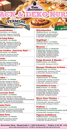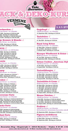 Als besonderes Highlight bieten wir in unseren Räumlichkeiten eine Vielzahl von Backkursen, Tortenkurse, Cupcake-Kurse, Cookie-Kurse, Modellierkurse u.v.m sowohl für Anfänger als auch für Fortgeschrittene.