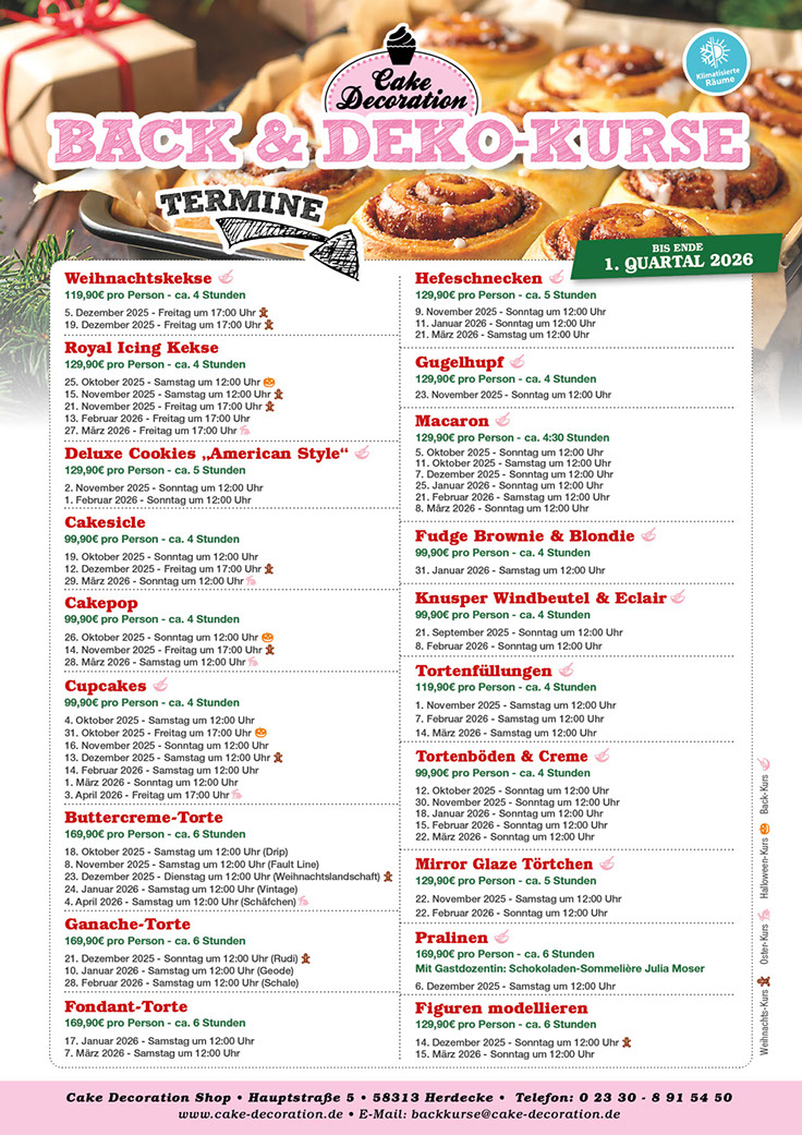 Booo & HoHoHo, es geht wieder los mit den Kursen im vierten Quartal. Als Neuheit bieten wir Euch einen Hefeschnecken Kurs mit saisonal wechselnden Füllungen an, super fluffig & mega lecker! Zum Thema Halloween dekorieren wir dieses Jahr schleimige und blutige Drip Cakes, Royal Icing Kekse, Cakesicles, Cakepops und Cupcakes. Zu Weihnachten darf unser Rentier als Ganache Torte natürlich nicht fehlen und kurz vor Weihnachten zaubern wir eine wunderschöne Buttercreme Torte mit weihnachtlicher Landschaft. Zu Ostern dekorieren wir im neuen Jahr gemeinsam unser süßes Buttercreme Schäfchen und natürlich sind all unsere beliebten Kurse auch wieder dabei. Wir freuen uns auf Euch!