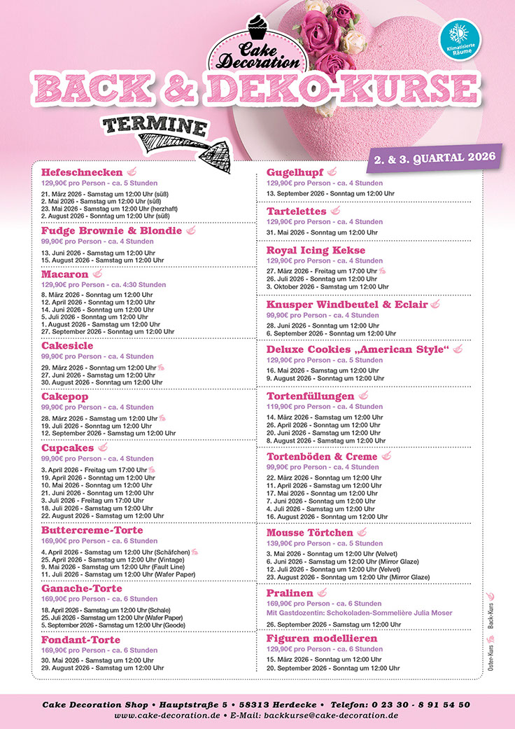 Es geht super lecker weiter mit dem zweiten und dritten Quartal. Als besonderes Highlight bieten wir euch den ersten herzhaften Kurs an. Gemeinsam backen wir unglaublich fluffige Hefeschnecken unter anderem mit selbst hergestelltem Pesto gefüllt und cremigem Frischkäse getoppt. Eine weitere Neuheit ist unser Mousse Törtchen Kurs mit Velvet Effekt. Die samtige Oberfläche und die ausgefallenen Füllungen sind aktuell besonders beliebt und elegant. Dank unserer klimatisierten Räume ist das Backen bei uns in den warmen Monaten super angenehm und erfrischend.