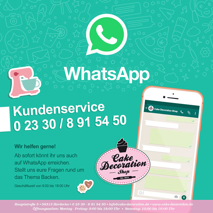 Ab sofort könnt ihr uns auch auf WhatsApp erreichen. Stellt uns eure Fragen rund um das Thema Artikelsortiment, Kurse oder Backen.