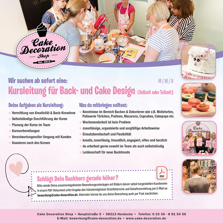 E-Mail an bewerbung@cake-decoration.de. Alternativ kannst du uns deine Bewerbung auch per Post zuschicken.